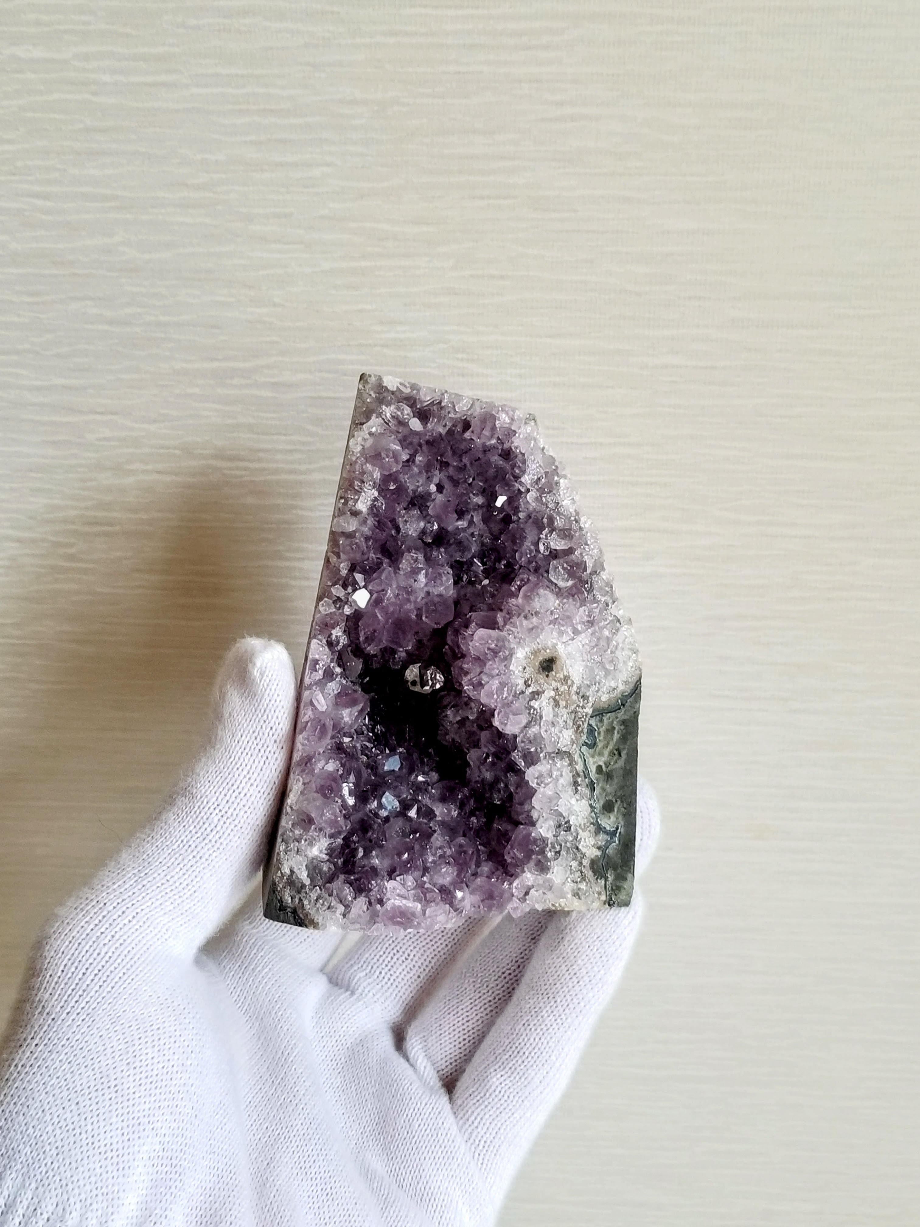 こちらは私が原石やアクセサリーのエネルギー検証時に使用しているアメジストになります。強い魔除け効果もありますので、人が集まるリビングや寝室、玄関などに置くのもいいですね